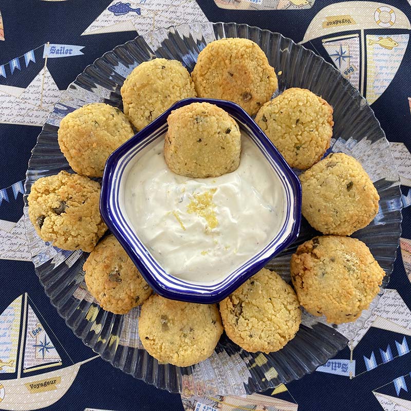 INGREDIENTI per 12 polpette: 150 g di cous cous, 50 g di formaggio spalmabile, 200 ml di brodo vegetale, 1 cucchiaio di capperi, 1 uovo, 1 mazzetto di basilico, 20 foglie di prezzemolo, olio evo, 150 g di yogurt greco 10% di grassi, la buccia di mezzo limone, qualche goccia di succo di limone, farina, olio per friggere, noce moscata, sale e pepe Andaliman di Spicebar.