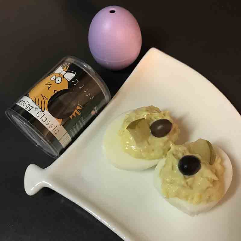 PROCEDIMENTO: Bollire le uova fino a che non siano sode, farle raffreddare e tagliarle nel senso della lunghezza. Sgocciolare il tonno e metterlo in una ciotola. Schiacciare i tuorli e unirli al tonno, aggiungere la pasta d’acciughe e lavorare il composto con una forchetta. Unire la maionese, girare il tutto e riempire le mezze uova. Guarnire con le olive e i cetriolini tagliati a pezzetti.