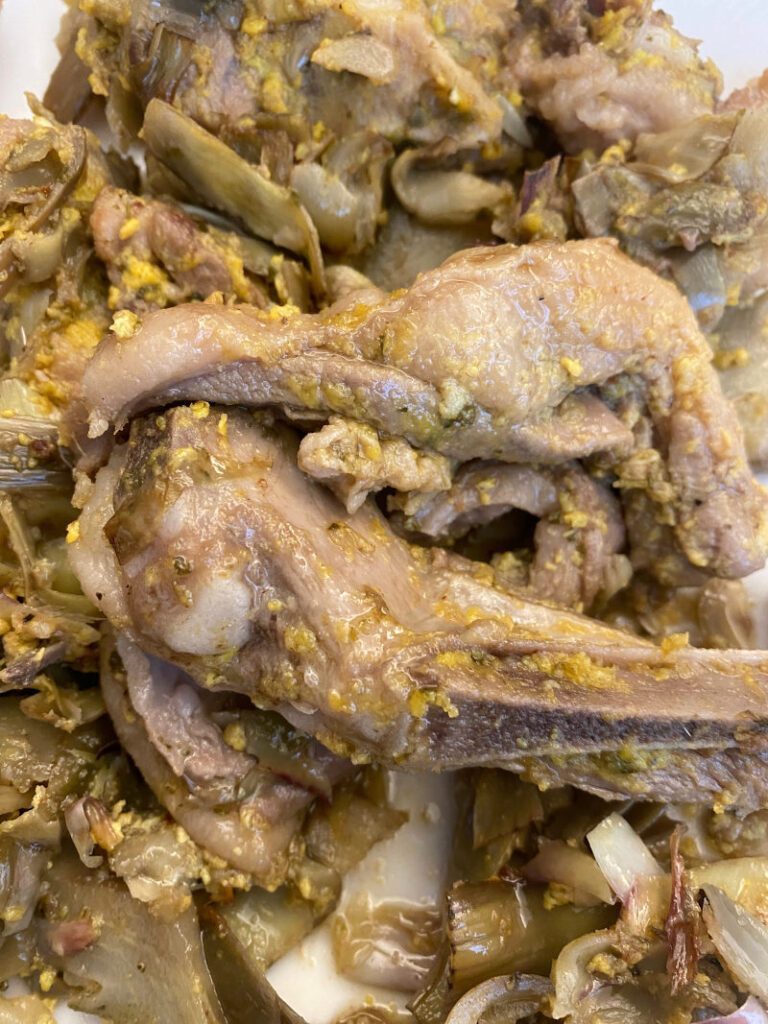INGREDIENTI per 3 persone: 1 kg di agnello a pezzetti, 3 carciofi, mezza cipolla, 1 spicchio d’aglio, 1 cucchiaio di prezzemolo tritato, vino bianco, 2 tuorli d’uovo, 1 limone, olio evo, sale e pepe.